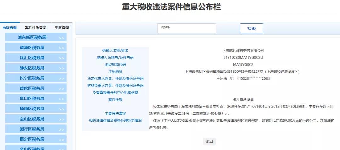 2、上海XX建筑勞務(wù)有限公司,經(jīng)國家稅務(wù)總局上海市稅務(wù)局第三稽查局檢查,發(fā)現(xiàn)其在20170704日至20180330日期間,主要存在以下問題:對外虛開普通發(fā)票51份,票面額累計434.48萬元。依照《中華人民共和國稅收征收管理法》等相關(guān)法律法規(guī)的有關(guān)規(guī)定,對其處以罰款50.00萬元的行政處罰,并依法移送司法機關(guān)。