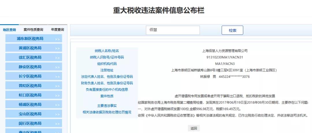 5、上海XX人力資源管理有限公司,經(jīng)國家稅務(wù)總局上海市稅務(wù)局第二稽查局檢查,發(fā)現(xiàn)其在20170619日至20180930日期間,主要存在以下問題:對外虛開增值稅銷項發(fā)票100,金額996.98萬元,稅額169.49萬元。依照《中華人民共和國稅收征收管理法》等相關(guān)法律法規(guī)的有關(guān)規(guī)定,已作出稅務(wù)行政處理決定,并依法移送司法機關(guān)。