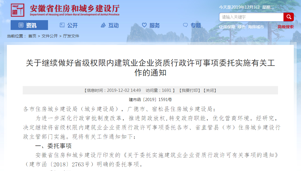 關(guān)于繼續(xù)做好省級(jí)權(quán)限內(nèi)建筑業(yè)企業(yè)資質(zhì)行政許可事項(xiàng)委托實(shí)施有關(guān)工作的通知(2019-12-3)