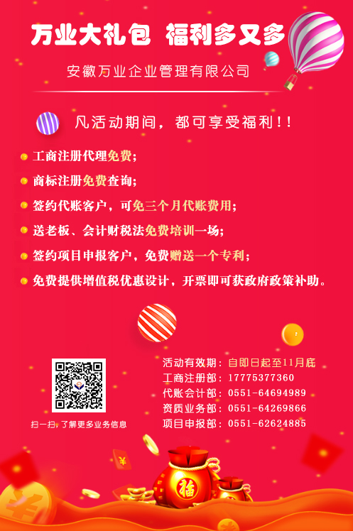 安徽萬業(yè)企業(yè)管理有限公司成立于2006年,從事企業(yè)服務(wù)十余年。公司主營業(yè)務(wù):資質(zhì)新報、升級、增項、公司注冊、財稅代賬、財務(wù)咨詢、項目申報等業(yè)務(wù)。且已經(jīng)成功辦理上萬家公司注冊、資質(zhì)申辦業(yè)務(wù)及財稅代賬客戶上千家。