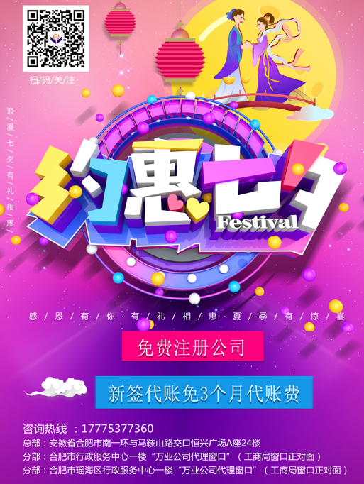 七夕情人節(jié) 七夕節(jié),又名乞巧節(jié)、七巧節(jié)或七姐誕,發(fā)源于中國(guó),是華人地區(qū)以及東亞各國(guó)的傳統(tǒng)節(jié)日,該節(jié)日來(lái)自于牛郎與織女的傳說(shuō),七夕現(xiàn)已成為中國(guó)情人節(jié)。 一年一度的七夕情人節(jié)(虐汪日)又到了 安徽萬(wàn)業(yè)祝全天下有情人 終成眷屬 在這樣特殊的日子里 怎么少得了優(yōu)惠活動(dòng)呢? 安徽萬(wàn)業(yè)特此推出優(yōu)惠大派送 快來(lái)圍觀??! 一大波送禮高潮正在趕來(lái) 01 免費(fèi)注冊(cè)公司 02 新簽代賬免3個(gè)月代賬費(fèi) 如此優(yōu)惠的活動(dòng)還不趕緊行動(dòng)起來(lái)! 選擇萬(wàn)業(yè)幫您輕松創(chuàng)業(yè),省心、省力、省時(shí)、贏在起跑線,成功快一步!同時(shí)簽約成功者還可以免費(fèi)介紹男女朋友喔